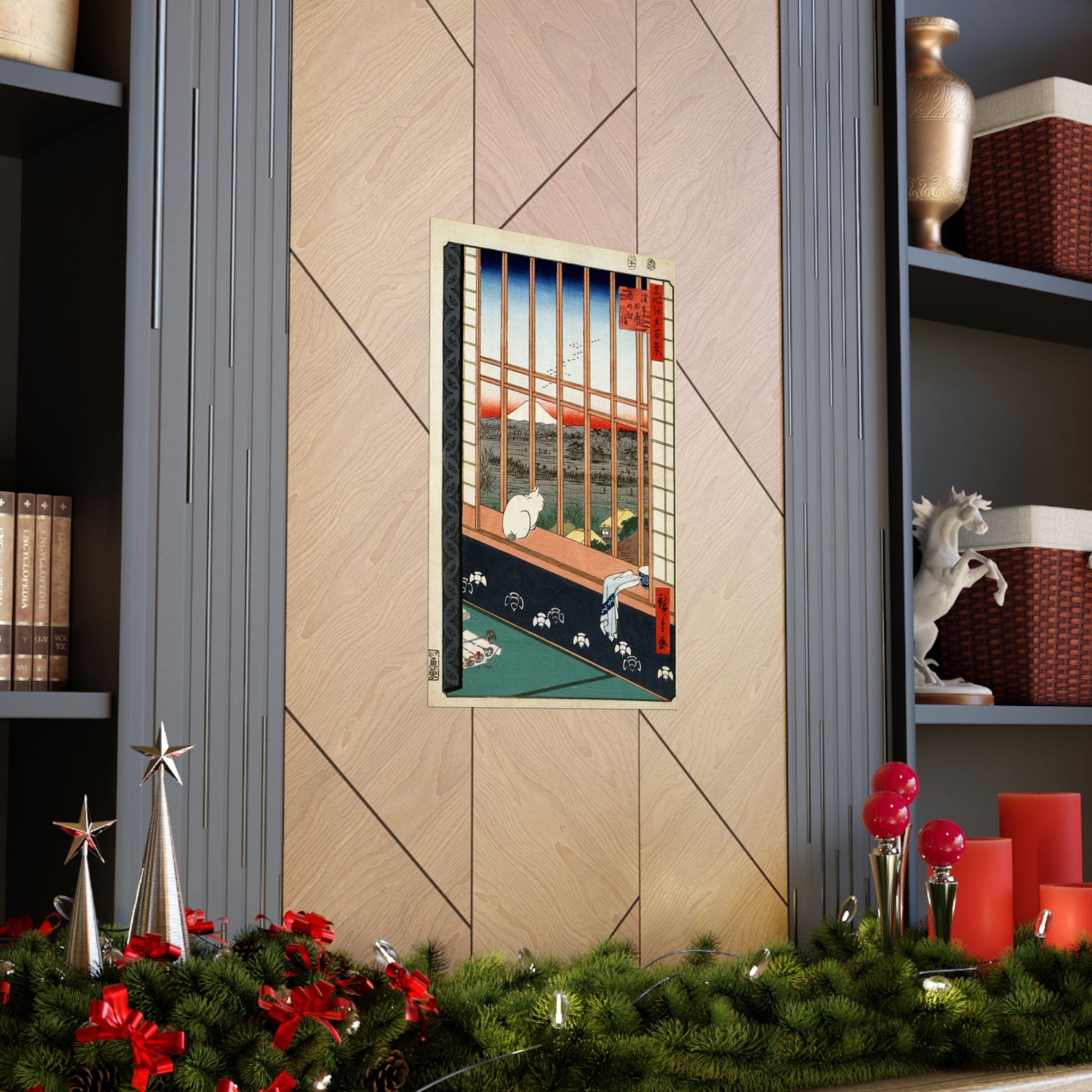 One of Hiroshige’s most quietly poetic compositions, Asakusa Ricefields and Torinomachi Festival (1857) captures Edo’s autumnal serenity through an intimate domestic scene. A white cat sits on a windowsill, gazing toward the distant silhouette of Mount Fuji beneath a vivid sunset sky.