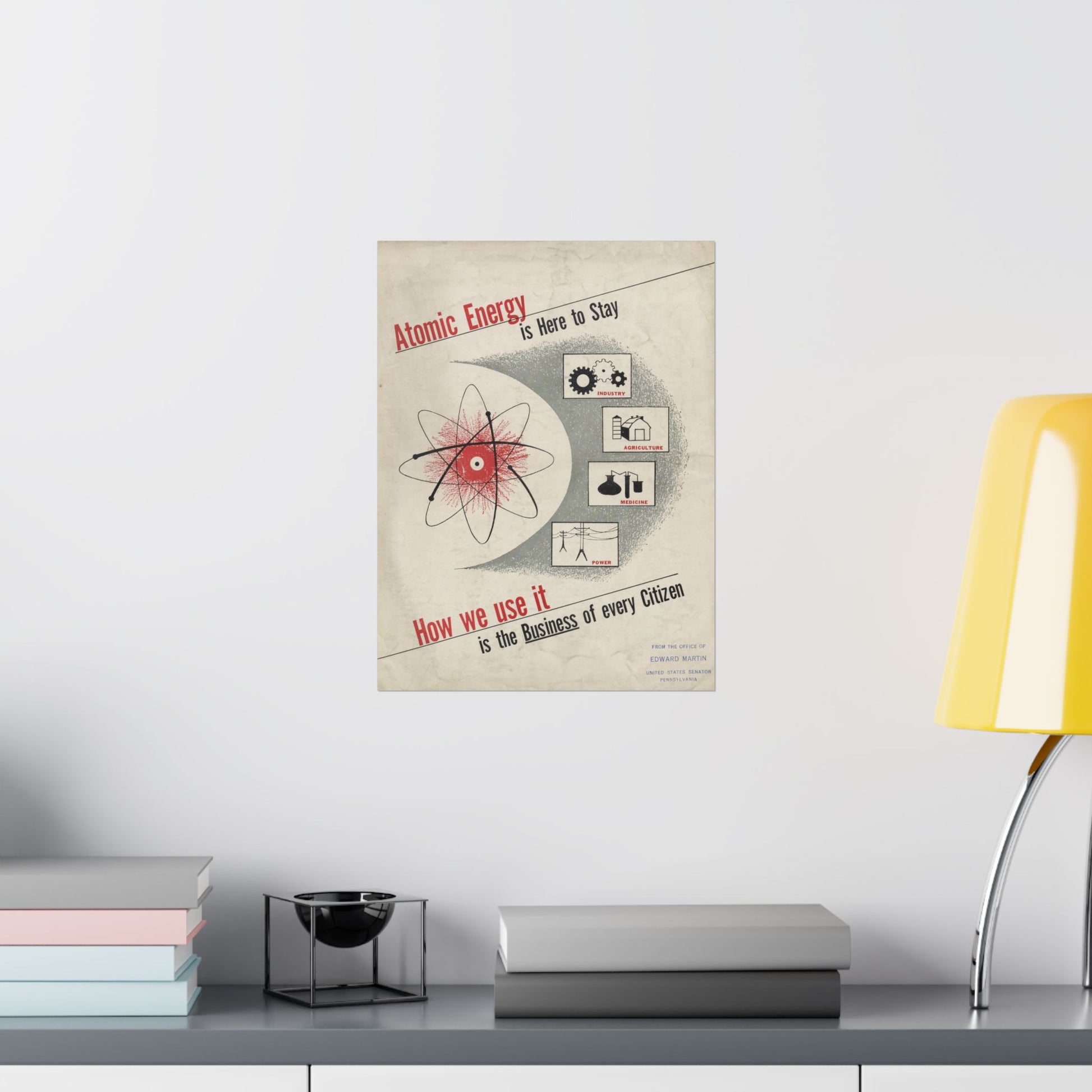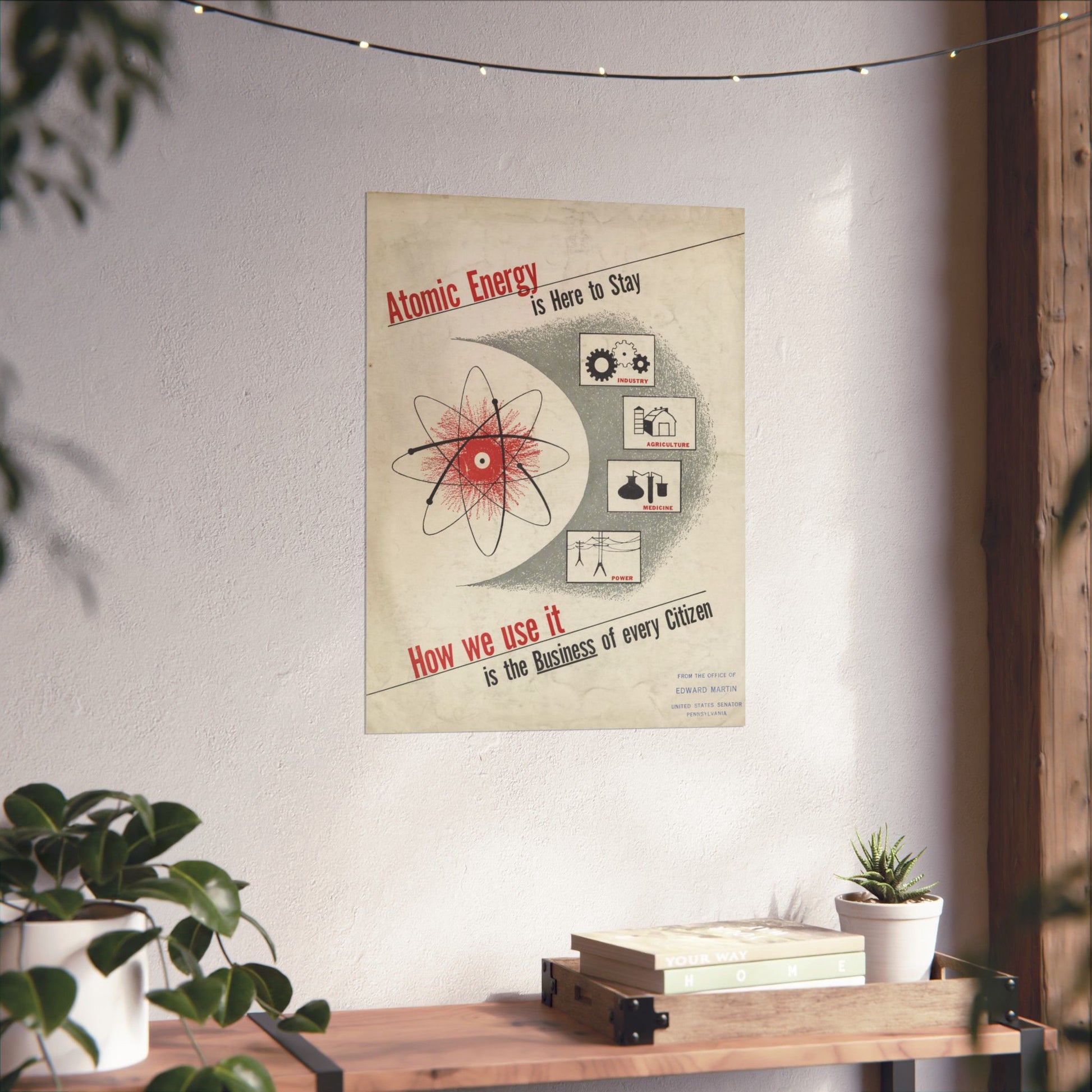 Step back into the dawn of the Atomic Age with this authentic reproduction of the 1950s U.S. government poster “Atomic Energy Is Here to Stay.” Originally distributed by the office of Senator Edward Martin of Pennsylvania, this piece captures the era’s fascination with atomic power — a bold vision of progress in industry, medicine, agriculture, and energy.