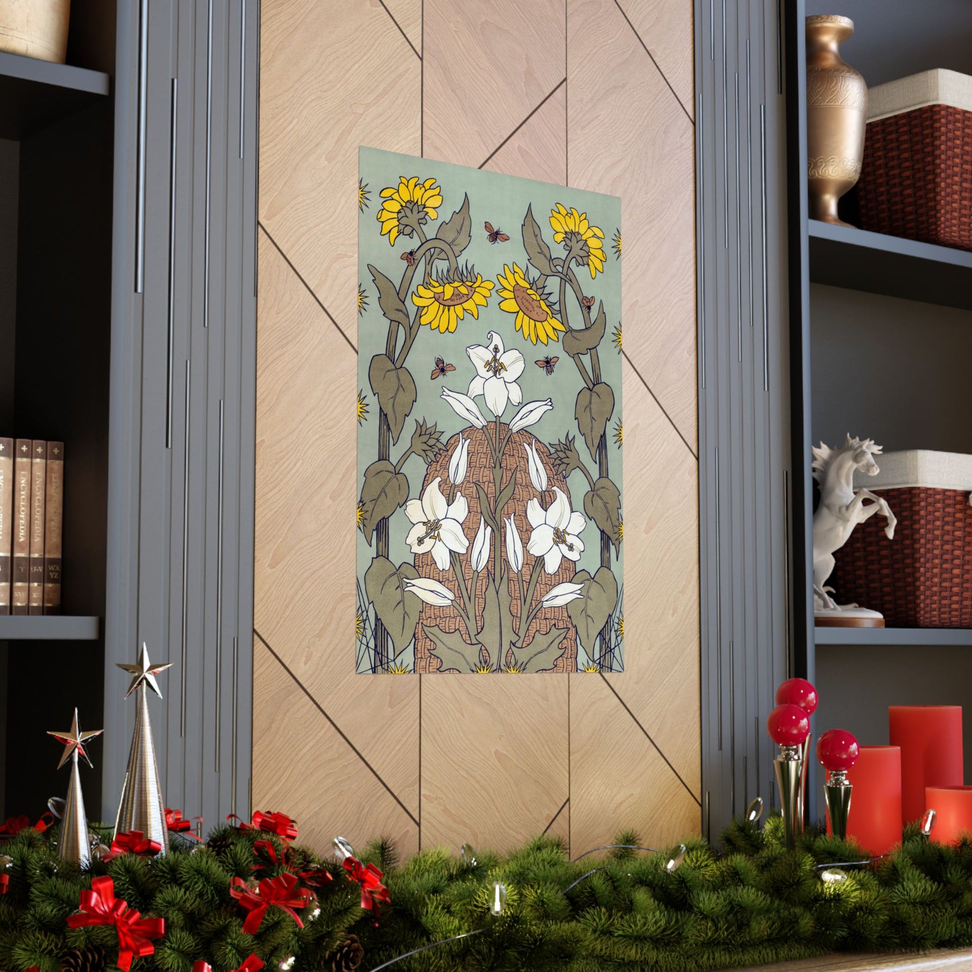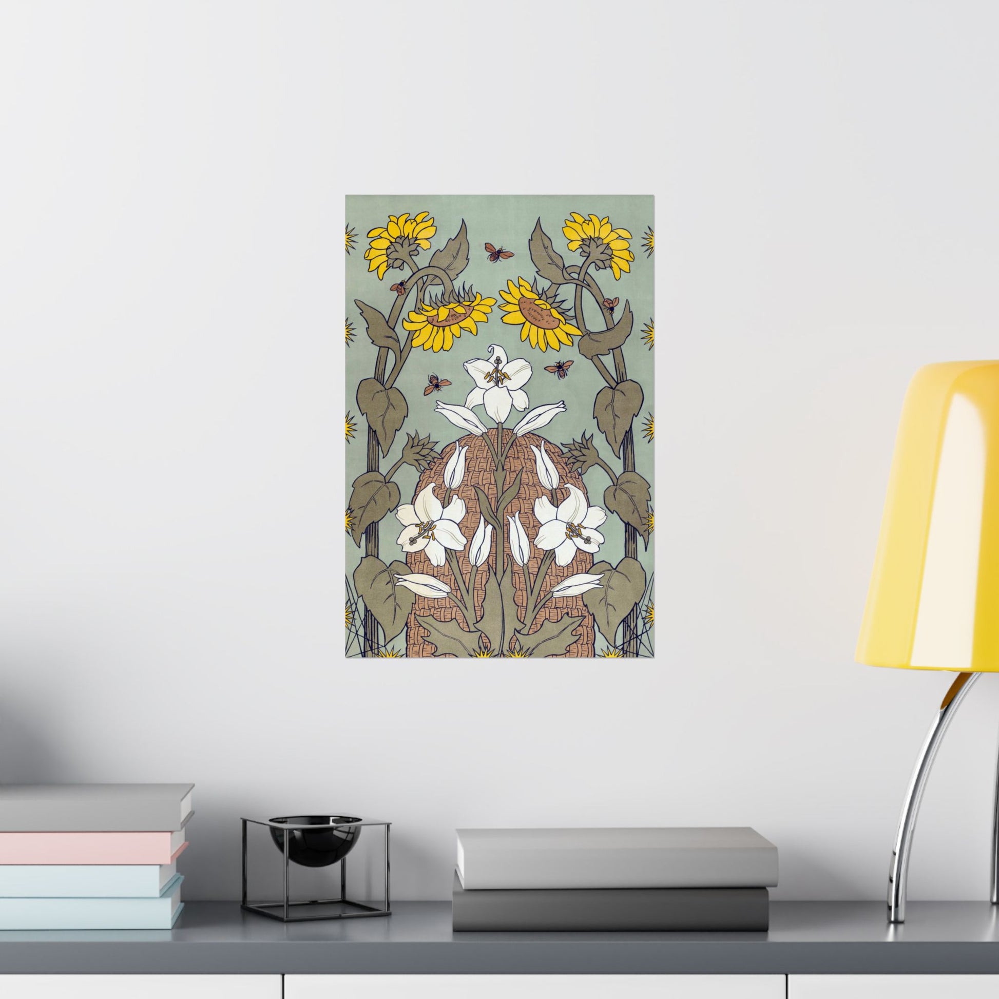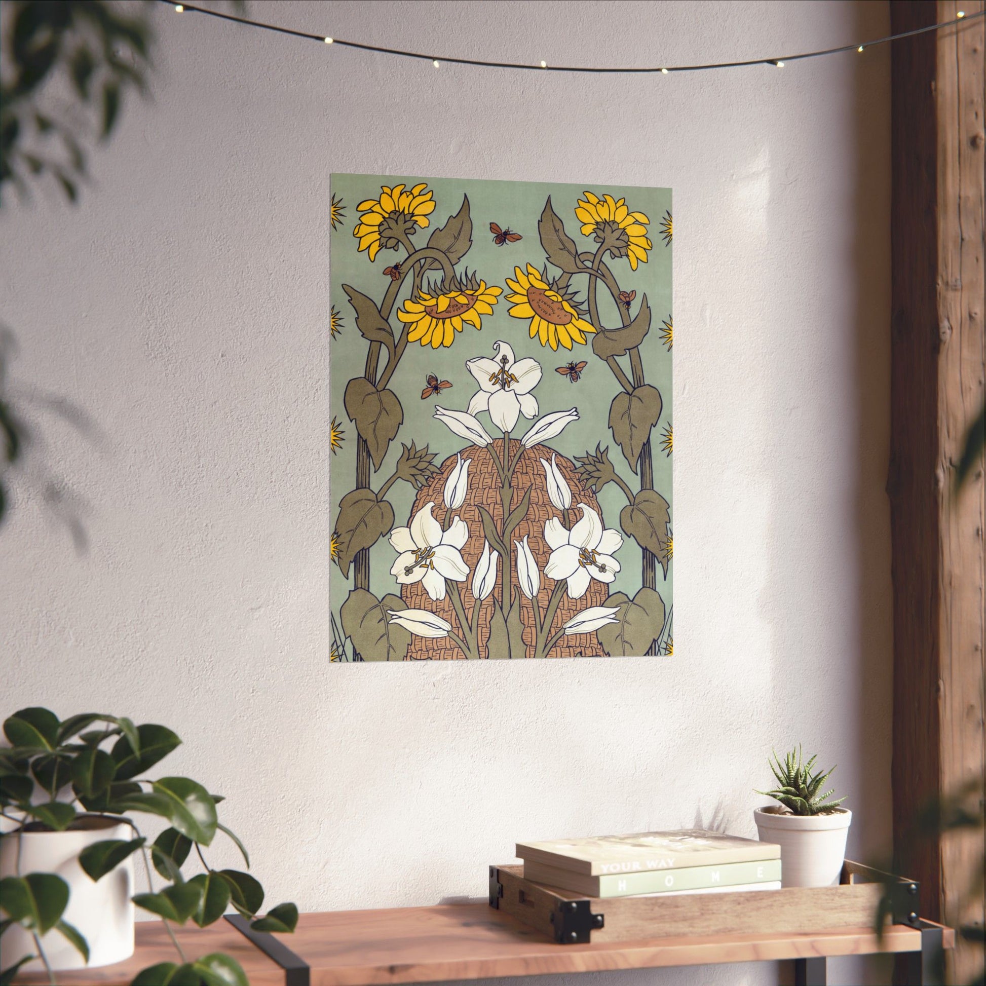 Created for the National Exhibition of Women’s Labor in The Hague, this Art Nouveau design is a luminous homage to nature, craft, and quiet cooperation. Sunflowers tilt toward a woven hive at the center, lilies bloom at its base, and bees float in gentle arcs around the composition. Fokker’s stylized linework and warm, harmonious palette embody the era’s fascination with organic forms and symbolic storytelling, turning a simple beehive into an emblem of unity and purpose.