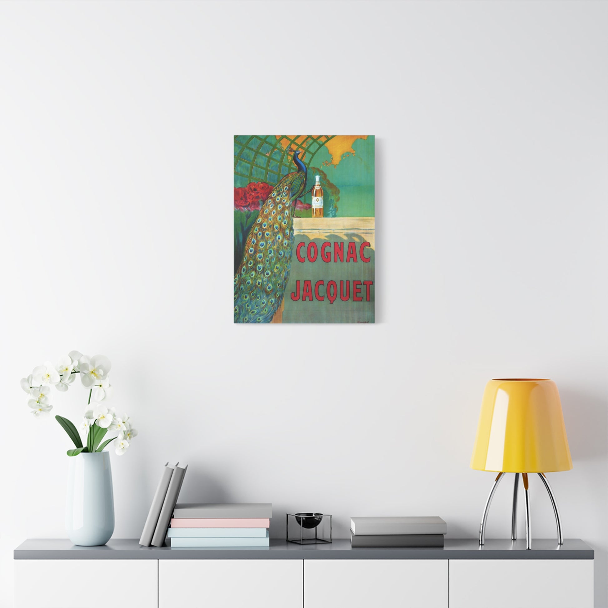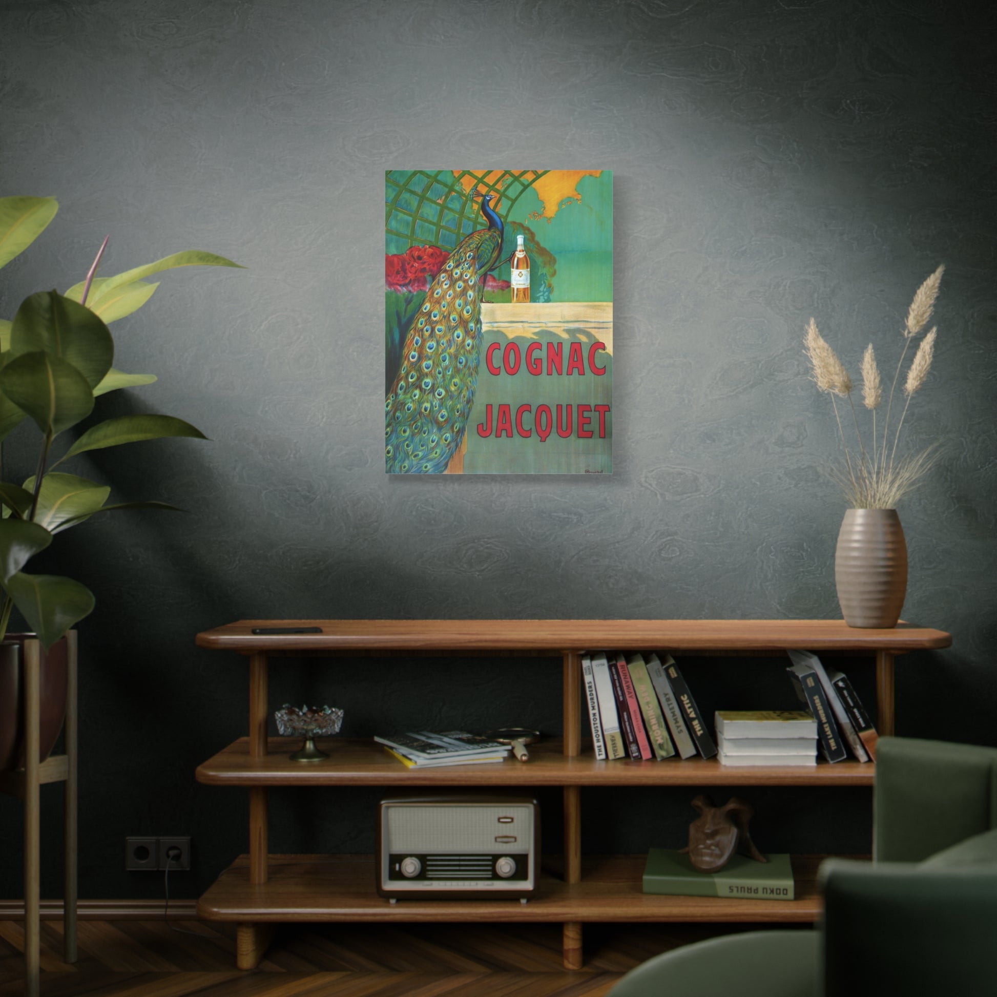 The peacock’s iridescent feathers shimmer against a warm, painterly background of green and gold, symbolizing refinement, beauty, and indulgence - qualities perfectly aligned with the sophistication of the Cognac Jacquet brand. The vivid typography and lush color palette make this piece a timeless tribute to vintage advertising artistry.