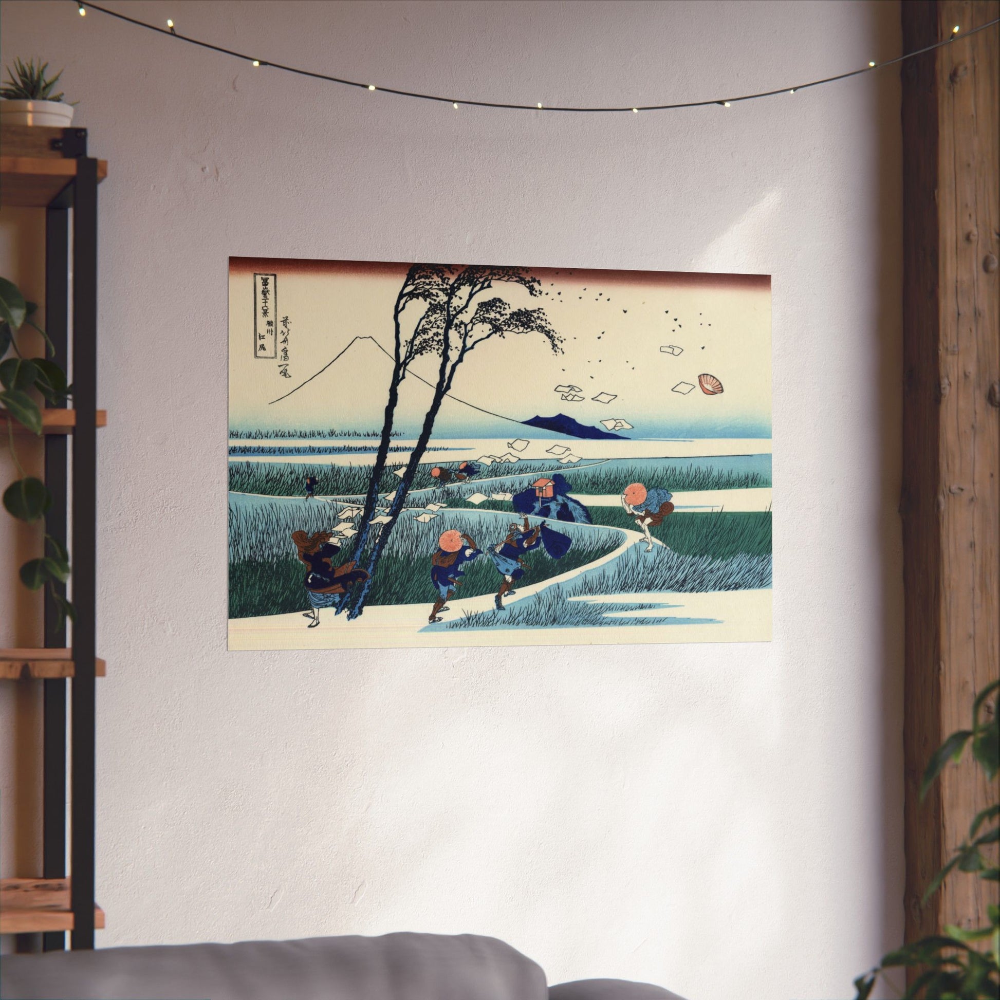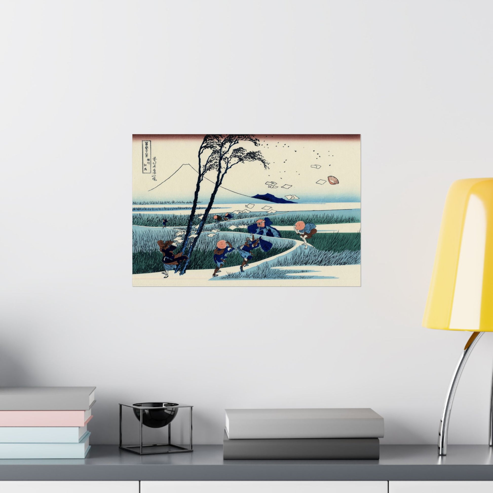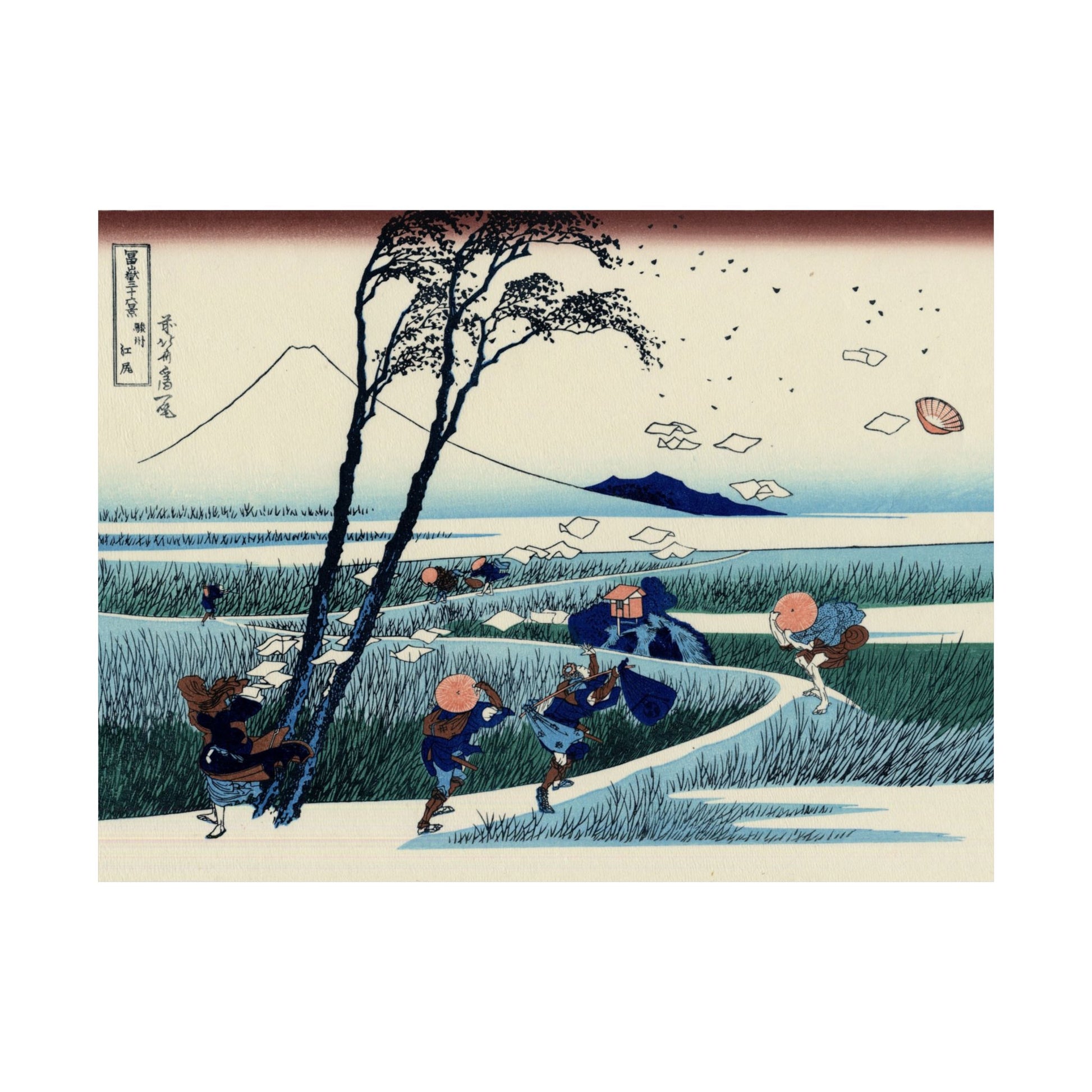 A whimsical and beautifully composed scene from Hokusai’s legendary Thirty-Six Views of Mount Fuji series, Ejiri in Suruga Province captures travelers caught in a sudden gust of wind. Papers and hats whirl through the air as Mount Fuji rises serenely in the distance - a masterful contrast between motion and stillness.