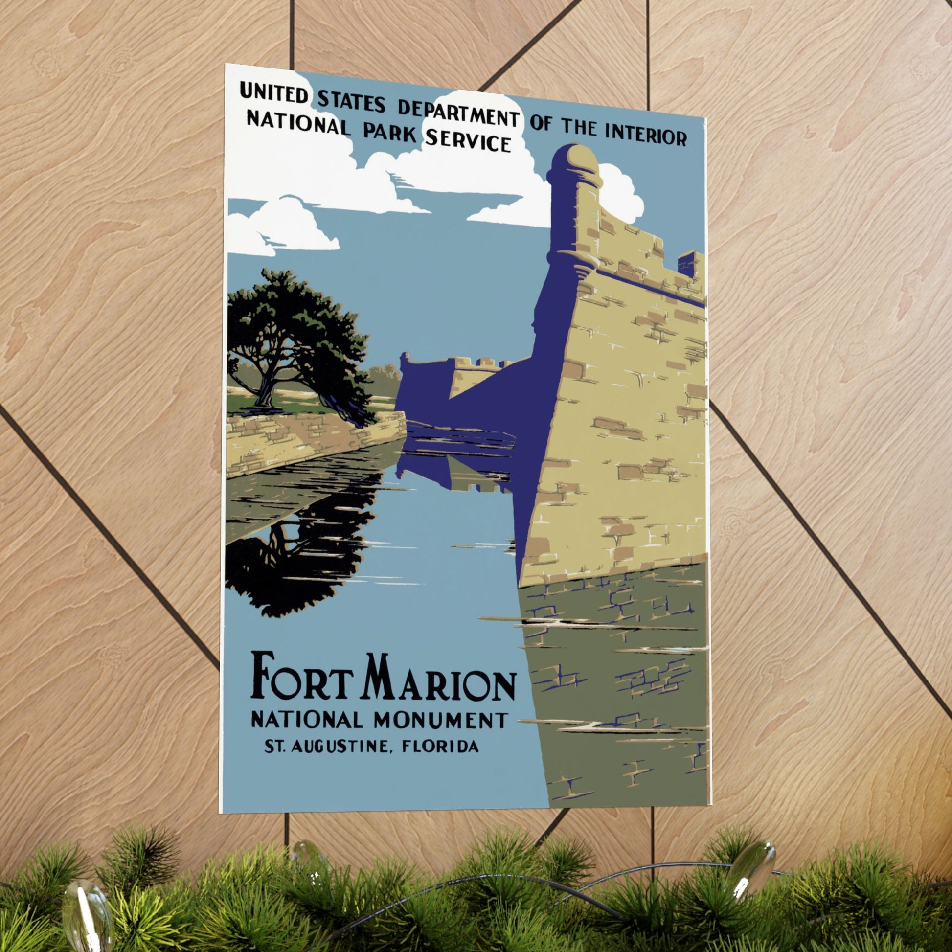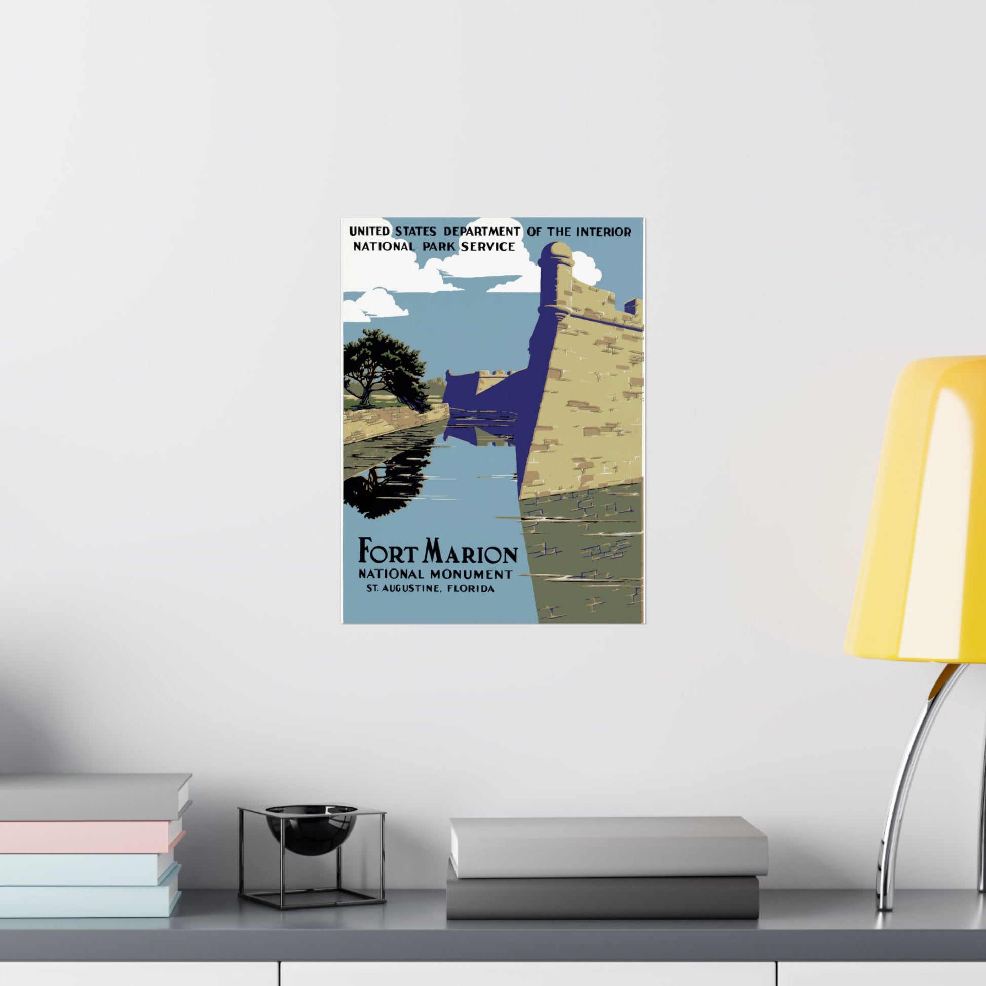 This vintage-inspired WPA poster captures the quiet strength of Fort Marion—today known as Castillo de San Marcos—rising above the still waters of its surrounding moat. The massive coquina walls, rendered in warm sandstone tones, angle sharply toward the viewer, emphasizing the fort’s geometric solidity and centuries-old endurance. Deep indigo shadows carve out dramatic contrasts, mirroring across the calm, glassy surface below. A lone windswept tree leans into the scene from the left, its dark silhouette balancing the bright coastal sky and lending a sense of place unmistakably tied to Florida’s shoreline.