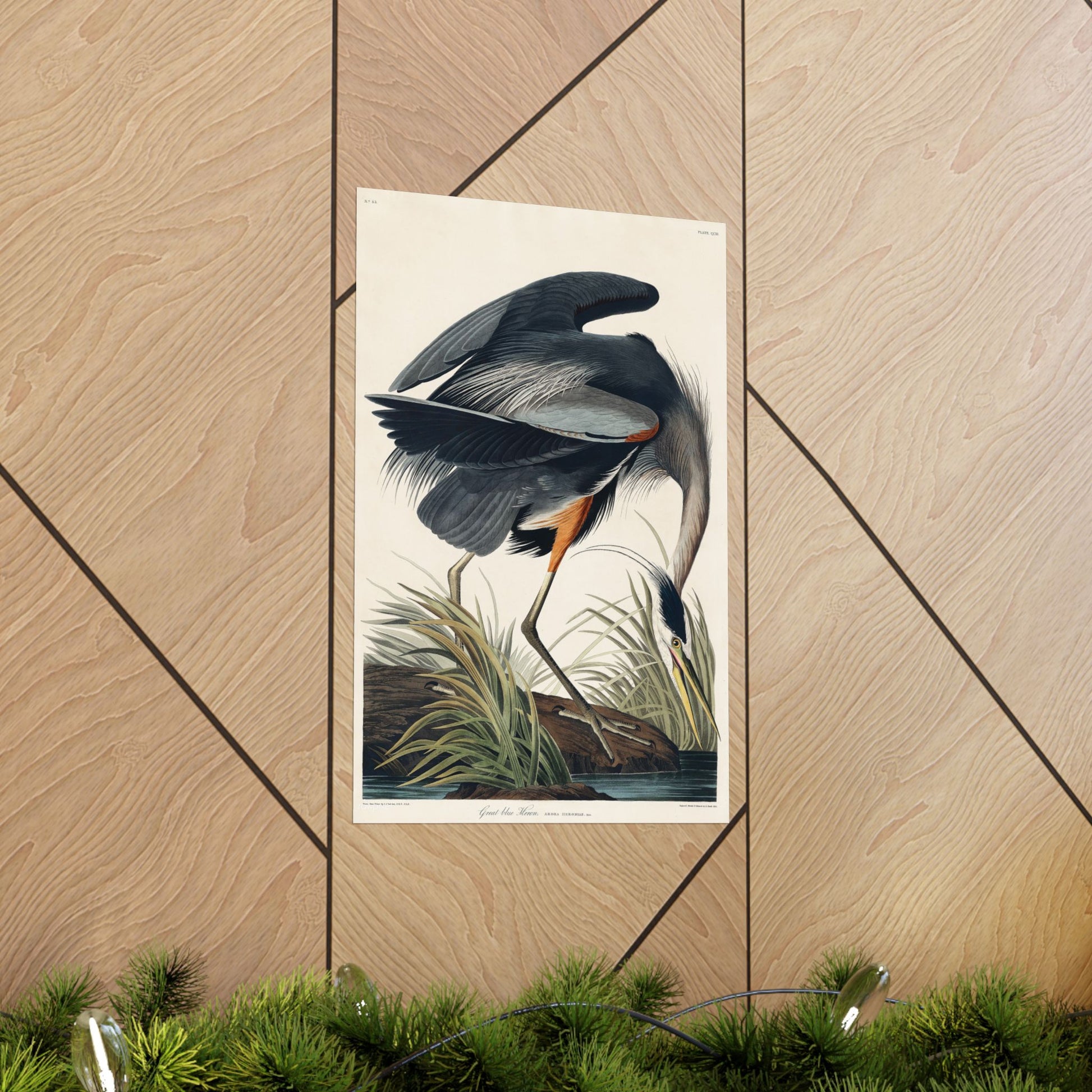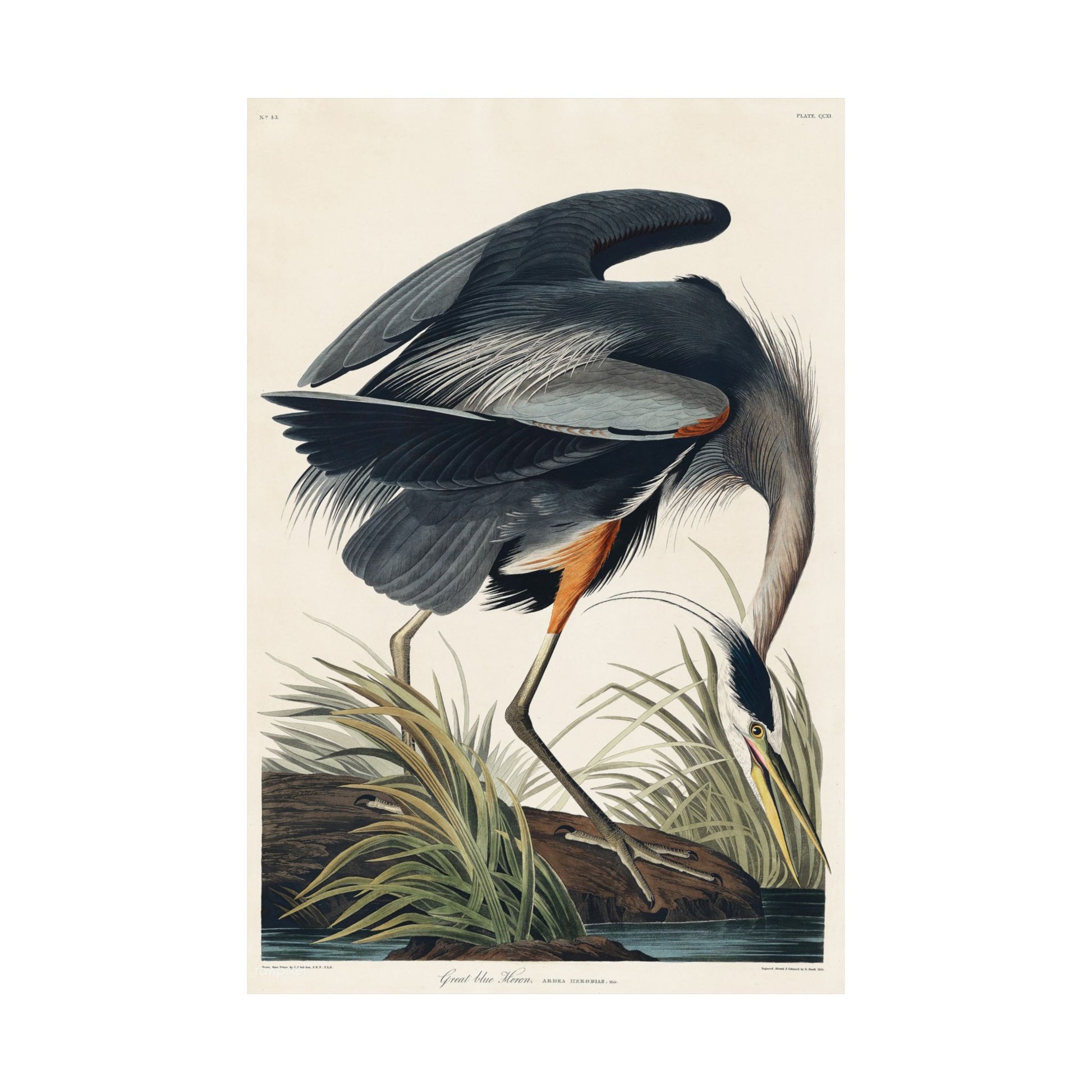 Add a touch of elegance and natural drama to your space with this reproduction of Great Blue Heron by John James Audubon. Rendered in striking detail, Audubon captures the heron in a poised stance, with its sweeping feathers, long neck, and sharp beak set against marsh grasses. The vivid blues, soft grays, and subtle orange accents make this one of his most iconic and visually dynamic bird portraits.