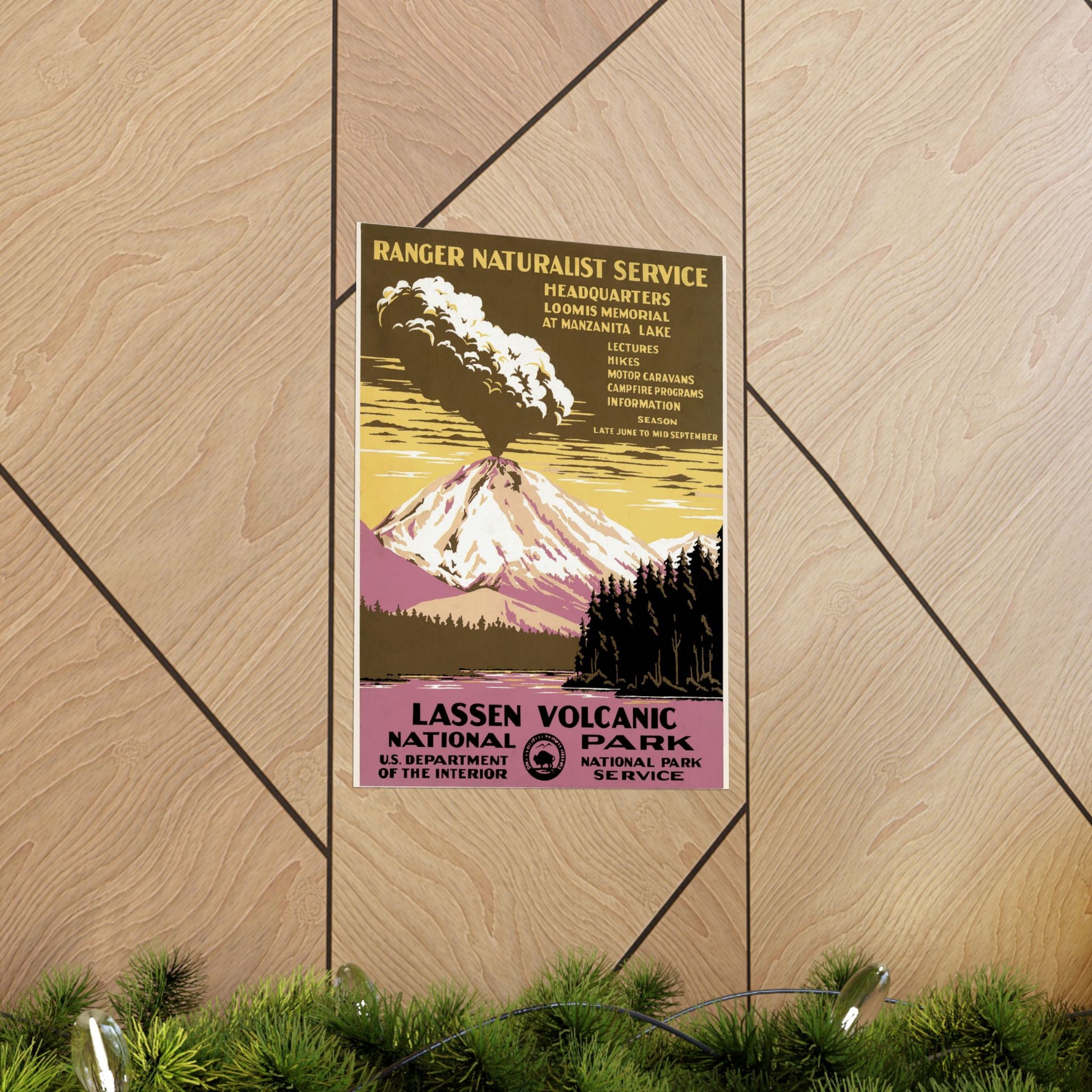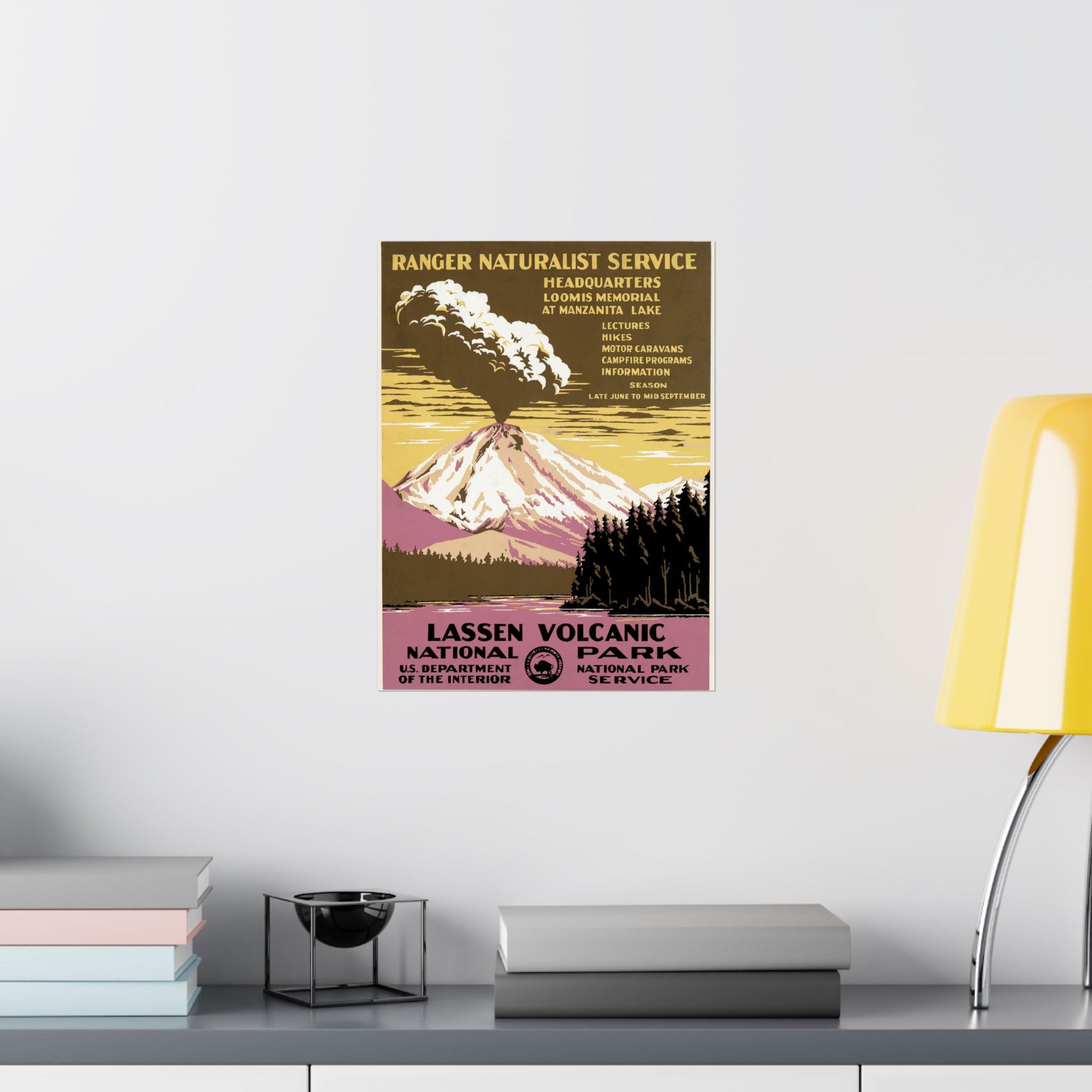 This dramatic WPA-era poster captures the raw, untamed energy of Lassen Volcanic National Park with a bold, stylized depiction of an erupting peak rising over Manzanita Lake. Billowing ash clouds unfold into the sky, framed by sunset tones of gold, mauve, and smoky brown—an atmospheric palette that echoes the park’s geothermal mystique. In the foreground, still water reflects the towering silhouette, while evergreens create a striking contrast against the pastel mountain slopes. Designed to promote the Ranger Naturalist Service, the poster promises lectures, hikes, campfire programs, and a full summer season of exploration.