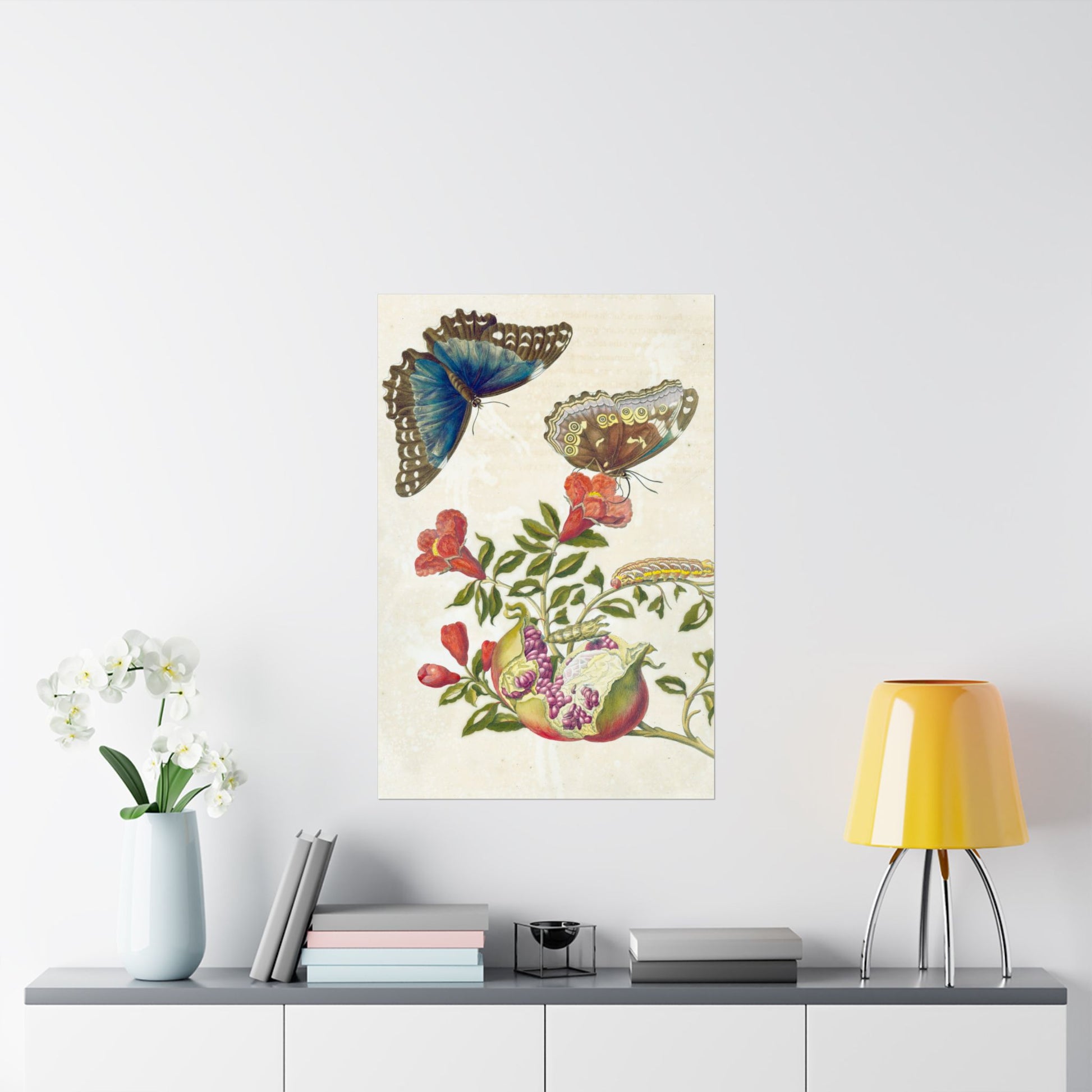 Bring a touch of timeless natural beauty to your space with this reproduction of Maria Sibylla Merian’s Metamorphosis Insectorum Surinamensium, one of the most enchanting works in early natural history illustration. This elegant composition pairs two brilliantly detailed butterflies and a lush pomegranate branch, creating a perfect balance of color and symmetry that complements both classic and modern interiors.