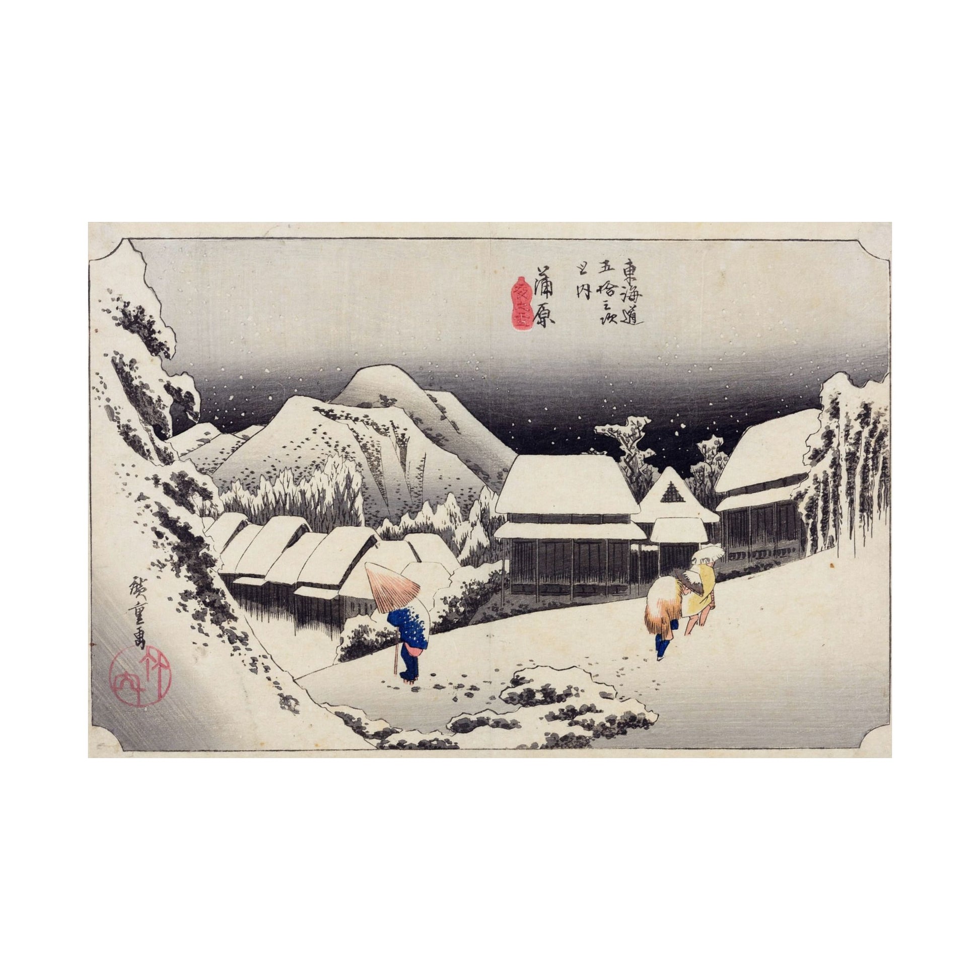 Part of Hiroshige’s celebrated Fifty-three Stations of the Tōkaidō series, this tranquil scene evokes the stillness and solitude of winter in Edo-period Japan. The delicate use of shading and contrast gives the snow a luminous depth, making it one of Hiroshige’s most poetic landscapes.