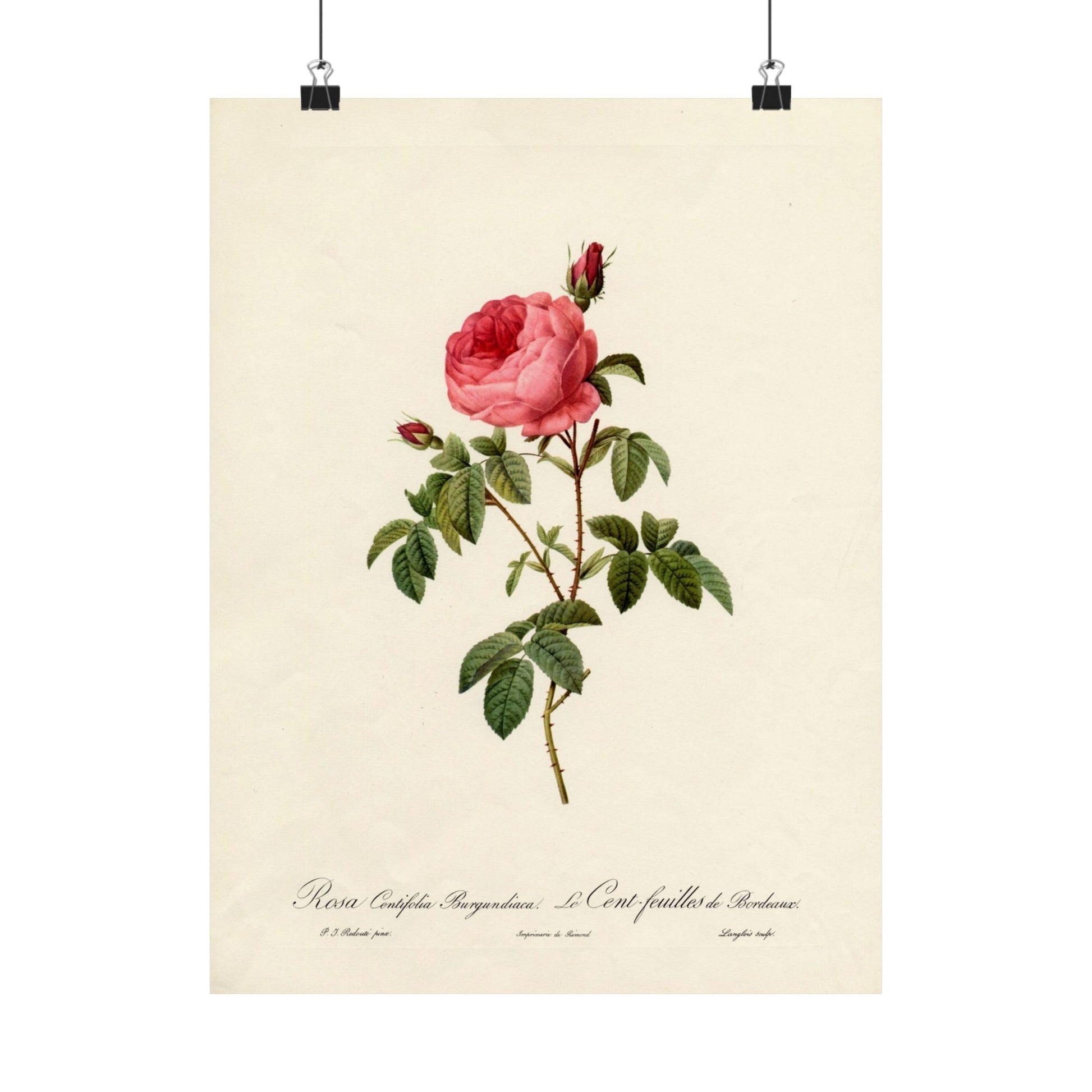 Elevate your home with the timeless beauty of Pierre-Joseph Redouté’s Rosa Centifolia Burgundiaca (Le Cent-feuilles de Bordeaux), a masterful study from the celebrated “Painter of Roses.” This elegant botanical print captures the rich pink bloom of the Burgundy rose, rendered with Redouté’s signature delicacy and precision. Every petal, leaf, and thorn is exquisitely detailed — a testament to both scientific observation and artistic grace.