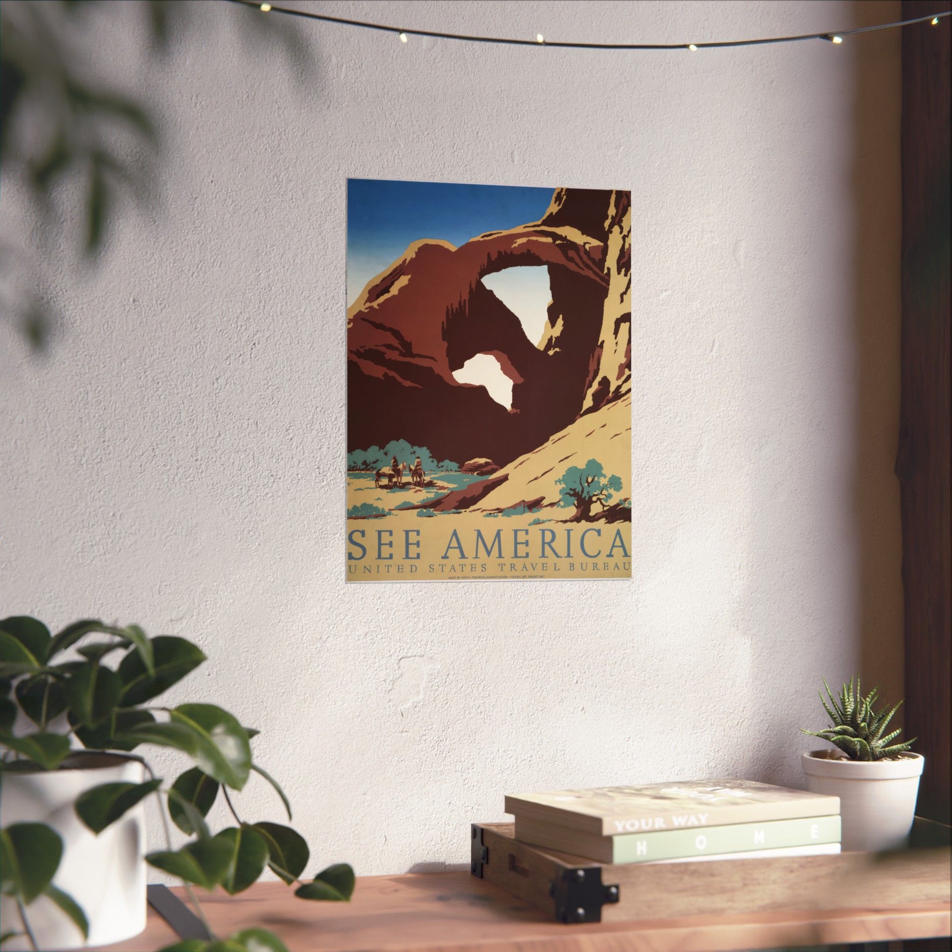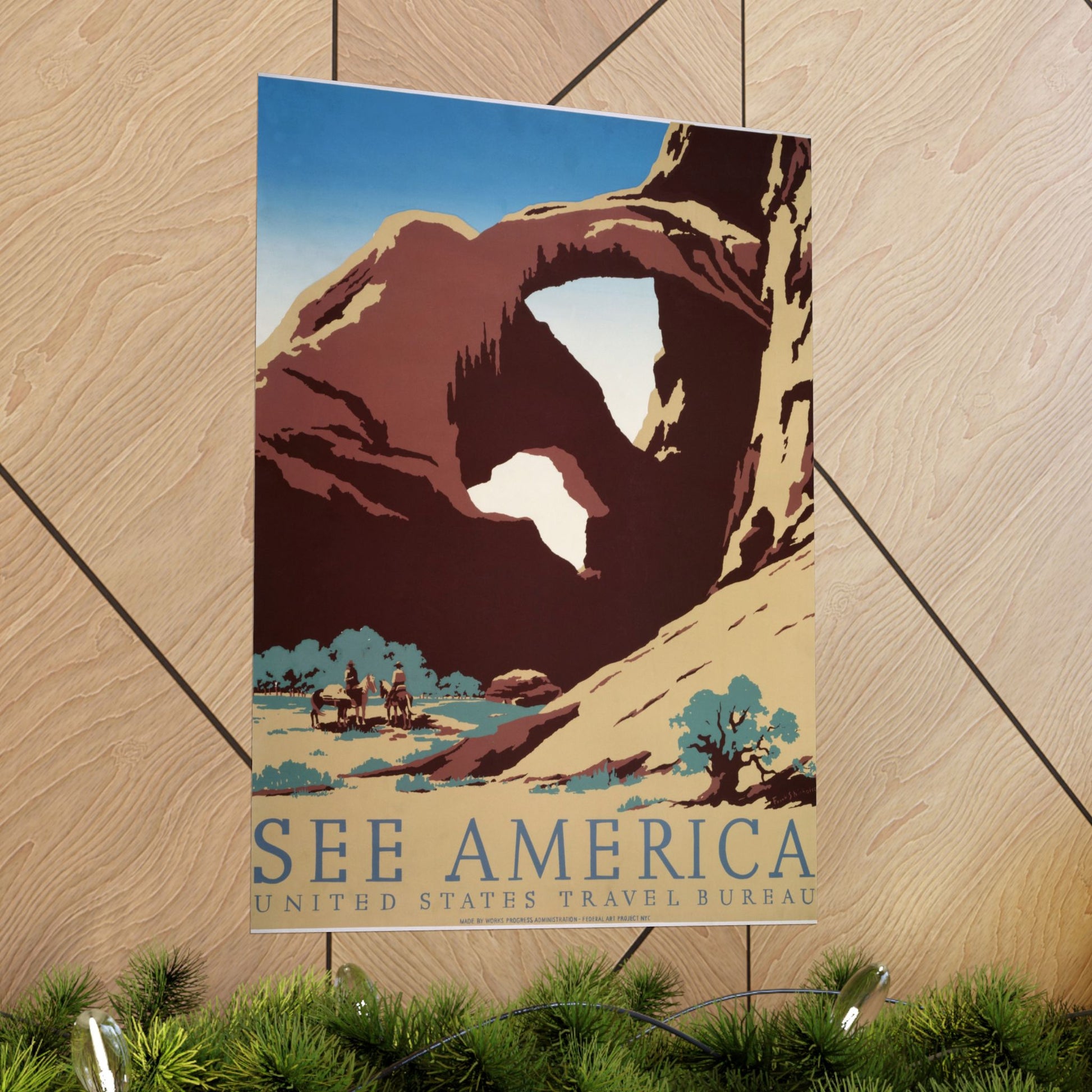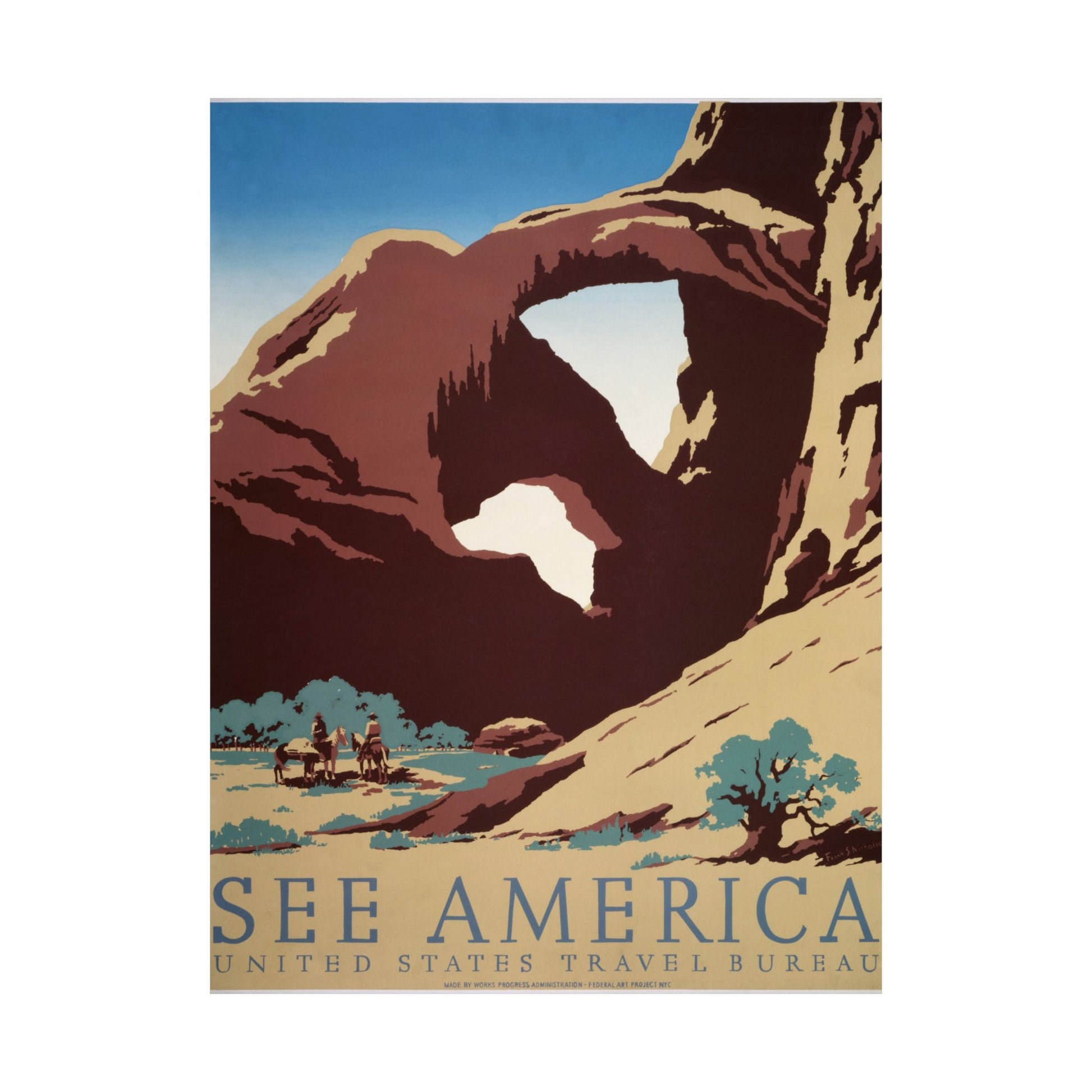 This classic See America travel poster celebrates the dramatic sandstone landscapes of the American Southwest. Bold, simplified shapes and warm earth tones capture the grandeur of a towering natural arch, while a pair of riders on horseback add scale and a sense of timeless exploration. It’s an inviting glimpse into the wide-open spaces that defined early U.S. travel imagery and remain iconic today.