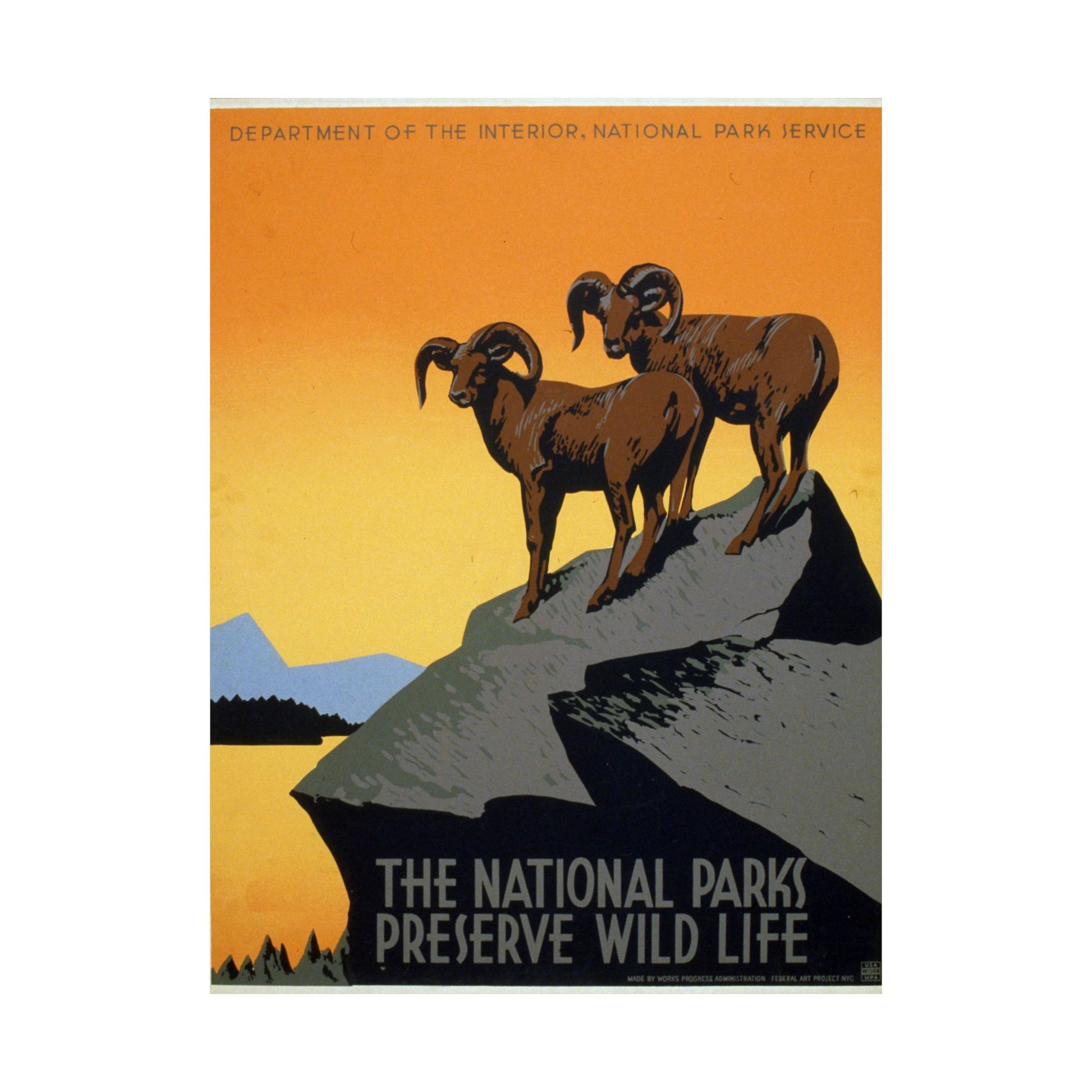 This striking WPA wildlife poster celebrates the early conservation mission of the National Park Service with a bold, minimalist depiction of two bighorn sheep standing proudly atop a rocky outcrop. Set against a warm, amber sunrise (or sunset) that fades from golden yellow to deep orange, the scene feels both serene and iconic - an idealized vision of America’s protected wilderness during the New Deal era.