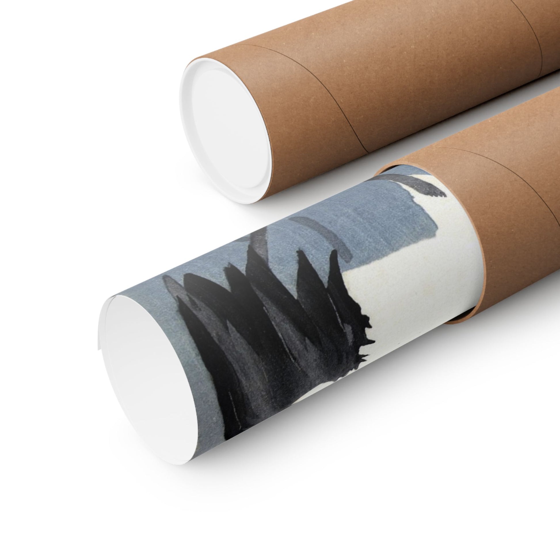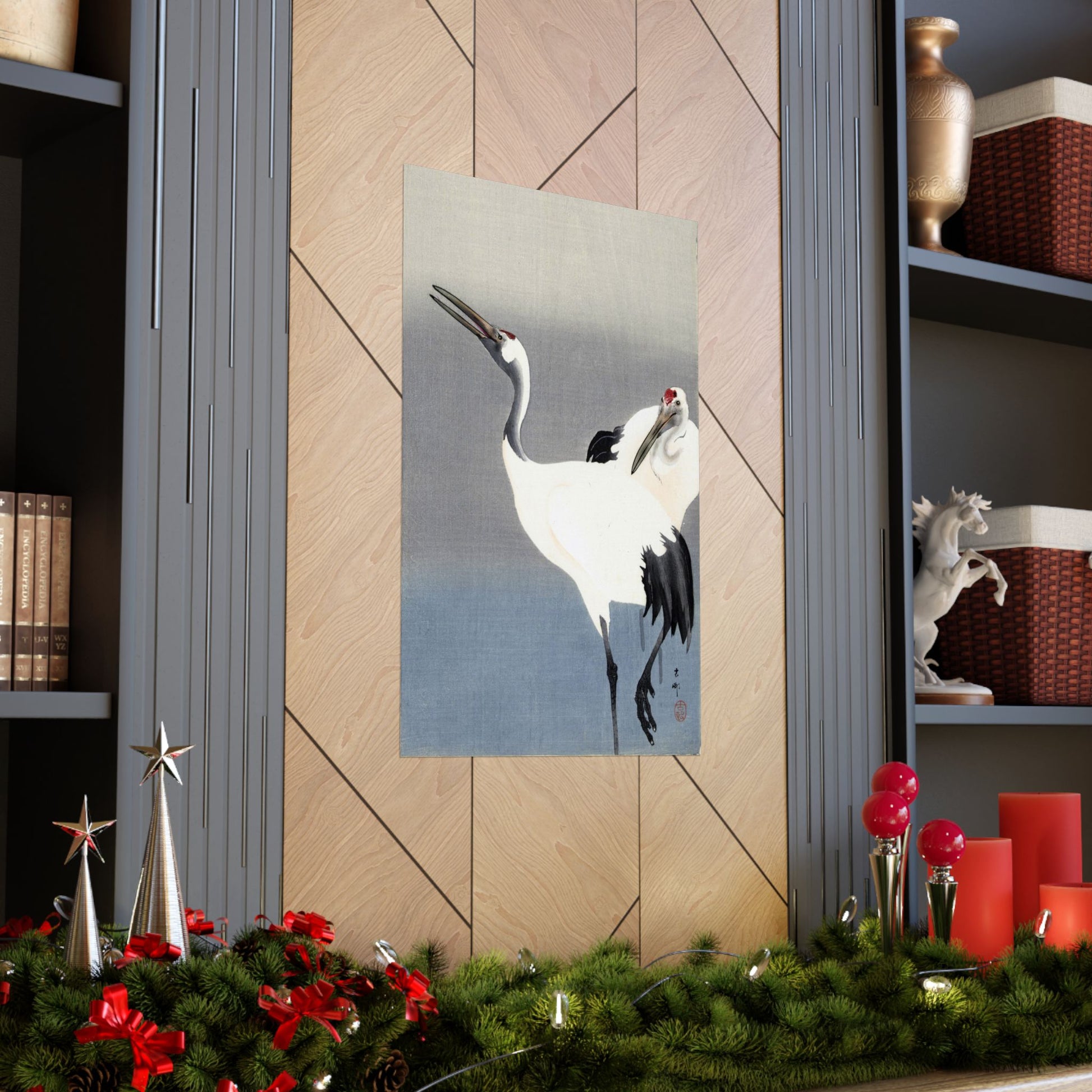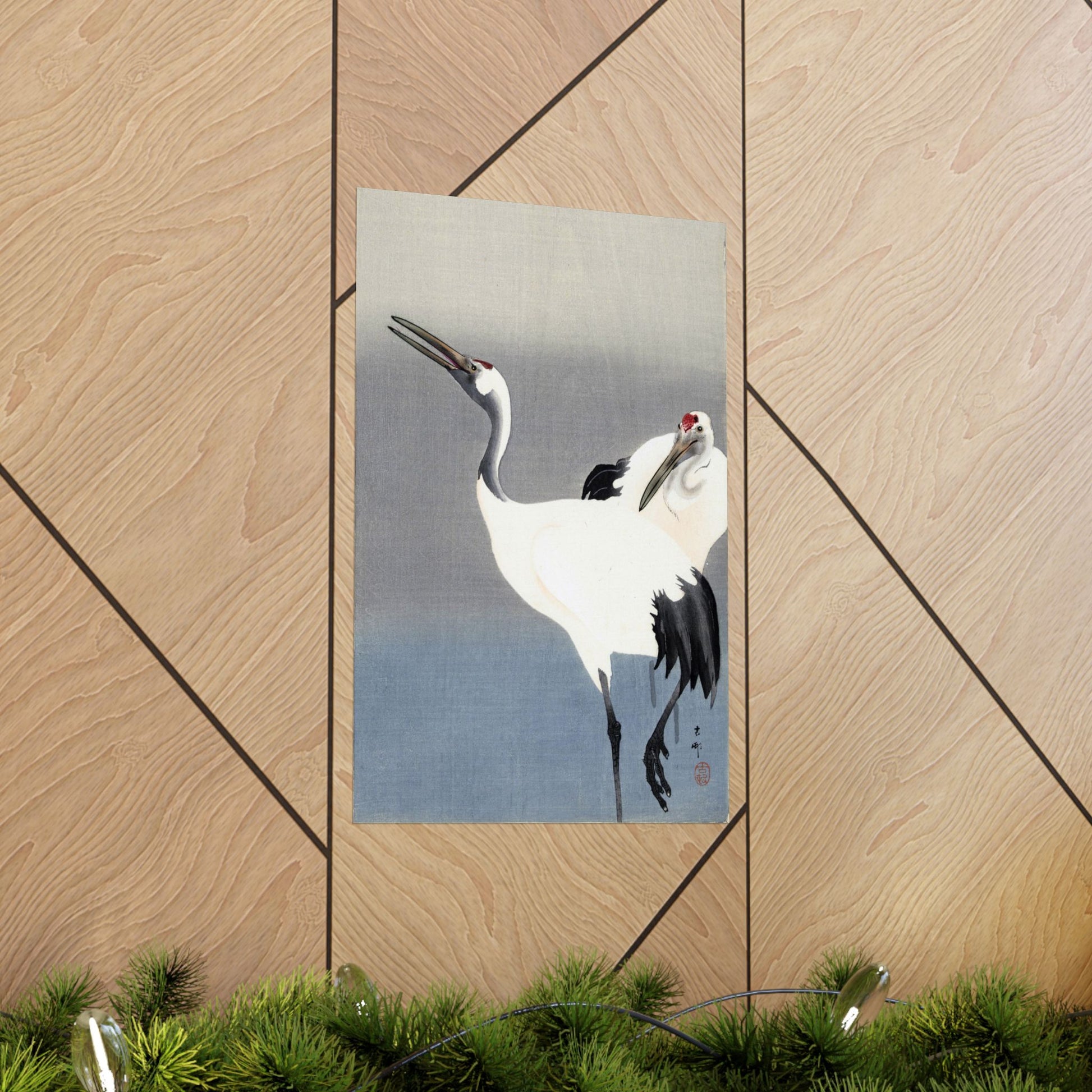 In Two Cranes, Ohara Koson captures the timeless elegance of these revered birds with a masterful blend of realism and restraint. Against a misty gradient of soft blues and grays, the cranes stand poised and dignified - one calling skyward, the other calm and contemplative.